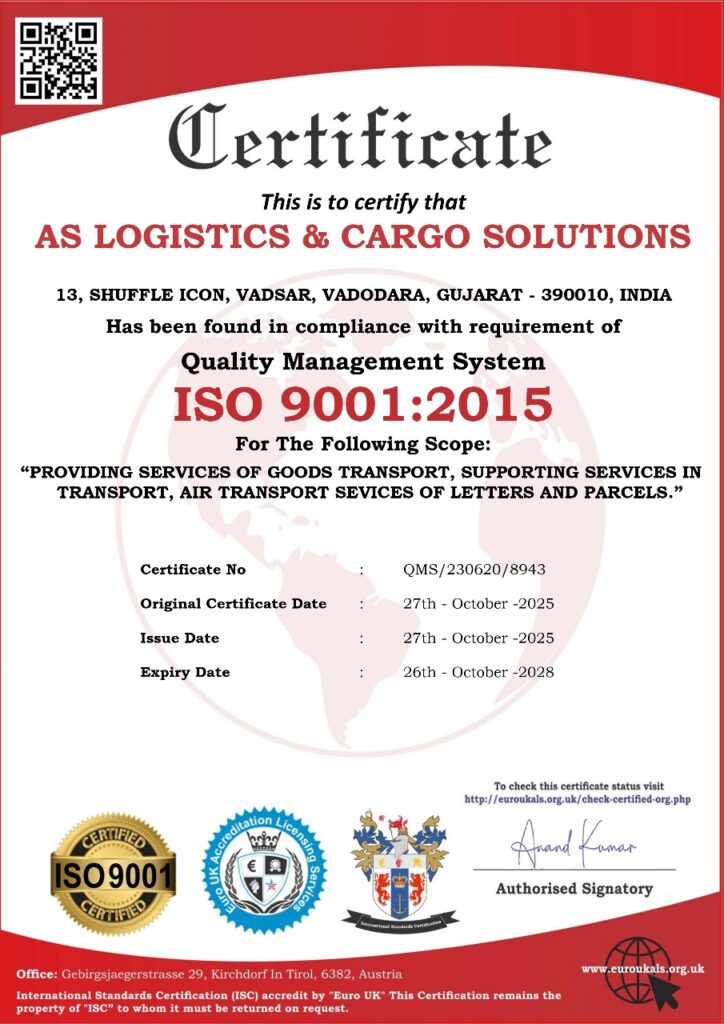 AS Logistics & Cargo Solutions is proud to announce that we are now ISO 9001:2015 certified, reaffirming our commitment to delivering consistent, reliable, and high-quality logistics services across all operations. This certification reflects our focus on continuous improvement, strong process management, and customer satisfaction.